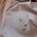 Introducing the Demeter Hestia Emerald Fan Necklace, a stunning and regal piece. This gold-toned necklace features a delicate chain with two elegant fan-shaped pendants, each adorned with vibrant green emeralds and sparkling crystals. The layered design adds a touch of grandeur, making it perfect for special occasions or a bold everyday statement. Inspired by the Greek goddesses of harvest and hearth, the Demeter Hestia necklace is a luxurious addition to any jewelry collection.