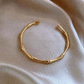 Introducing the Artemis Hestia Bamboo Cuff Bracelet, a minimalist yet striking piece. This gold-toned open cuff features a sleek, segmented design inspired by the natural elegance of bamboo, offering a perfect balance of simplicity and sophistication. Ideal for stacking or wearing alone, the Artemis Hestia bracelet, inspired by the Greek goddesses of the hunt and hearth, adds a touch of earthy charm to any jewelry collection.