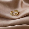 Presenting the Rhea Dionysus Ring, a striking gold band that dances with vibrant energy and elegance. Its unique zigzag design, encrusted with shimmering gemstones, creates a bold yet harmonious pattern. The adjustable open structure ensures a comfortable fit, making it a versatile piece for any occasion. Perfect as a bold statement or a thoughtful gift, this ring blends creativity with a touch of wild charm. Let its dynamic sparkle elevate your jewelry collection with divine flair.